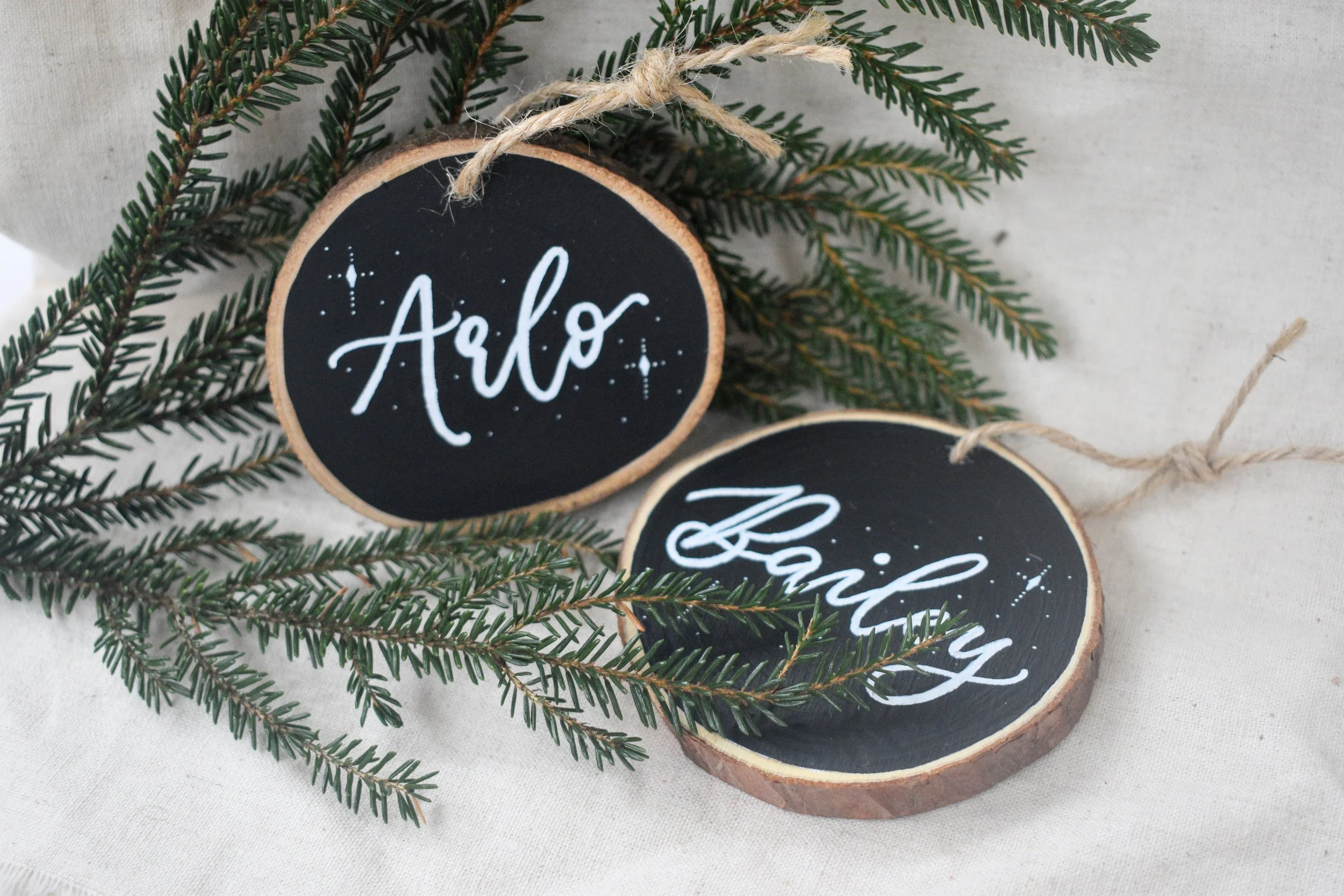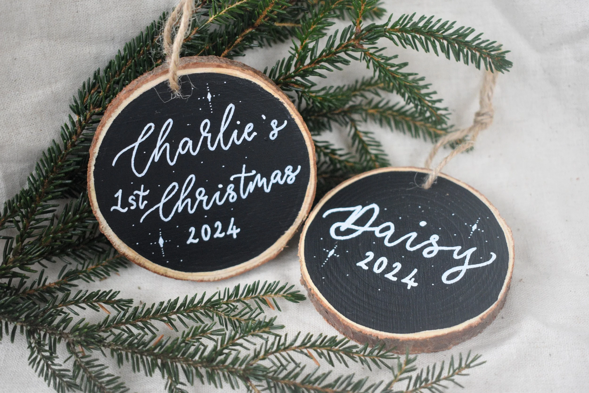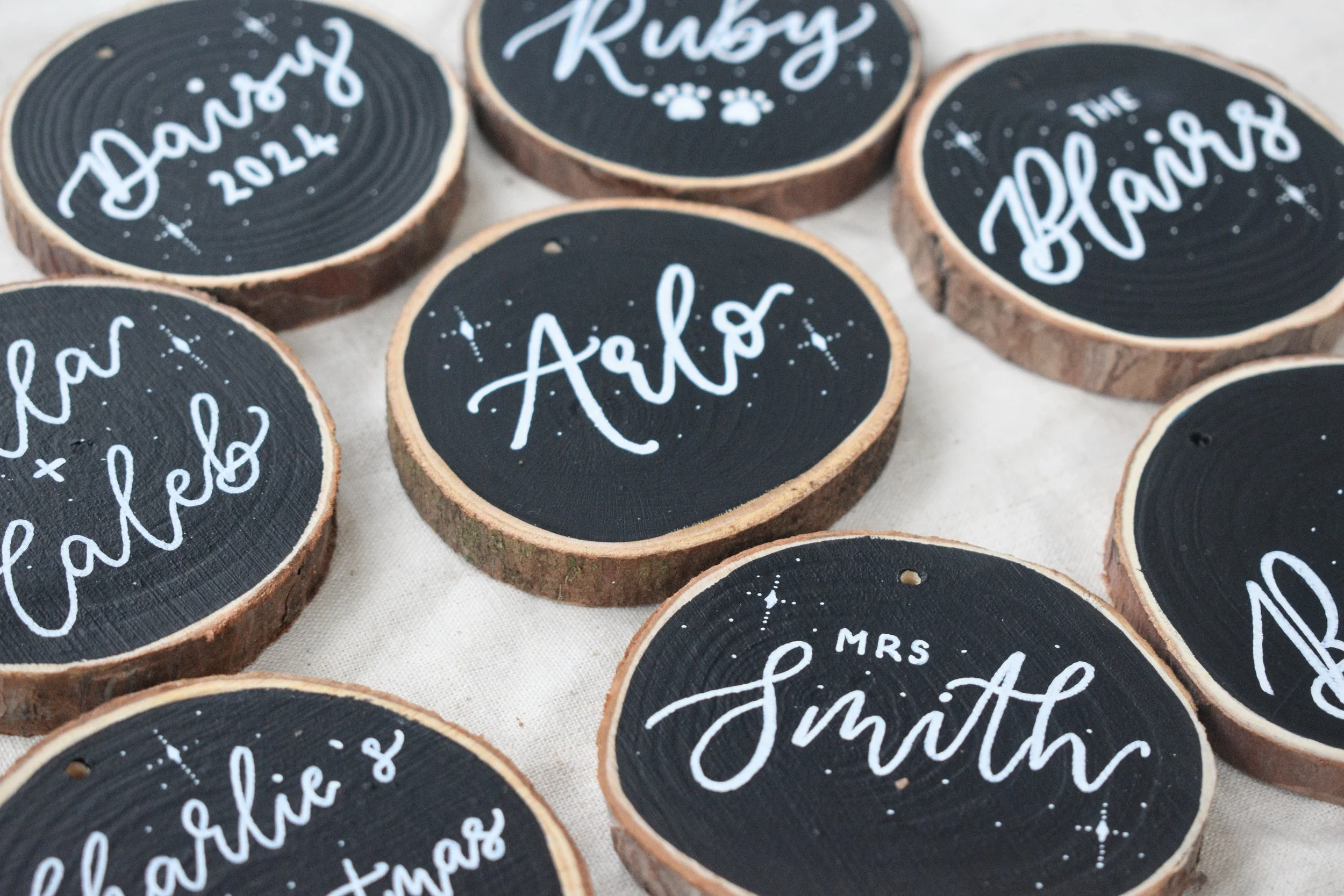 Add a touch of botanical charm to your tree with this hand painted Christmas decoration, featuring golden leafy vines . Each ornament is hand drawn and handwritten with your chosen name, making it a lovely keepsake.