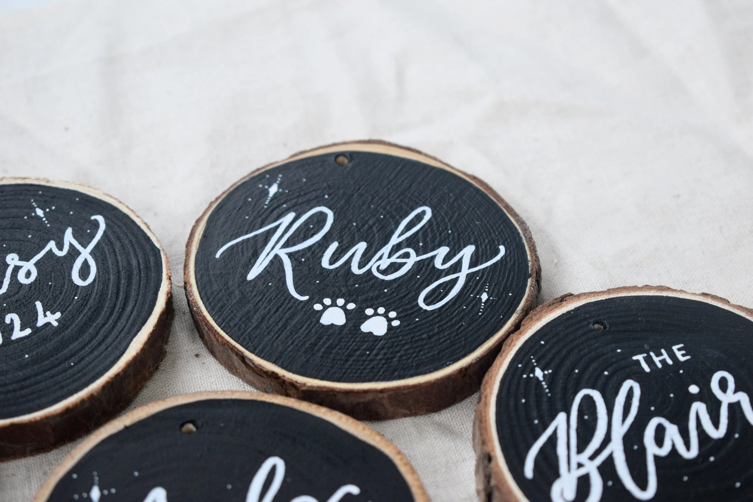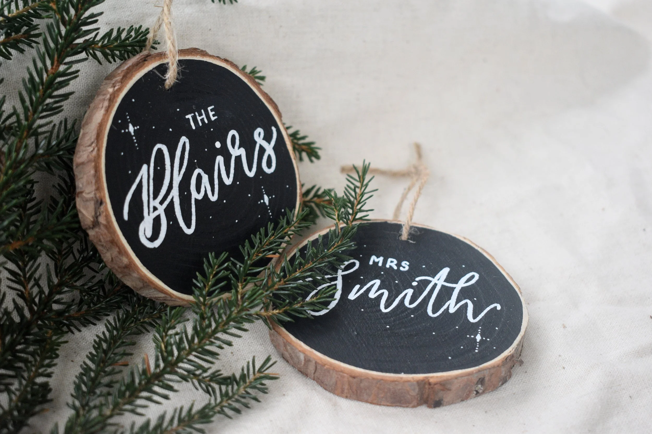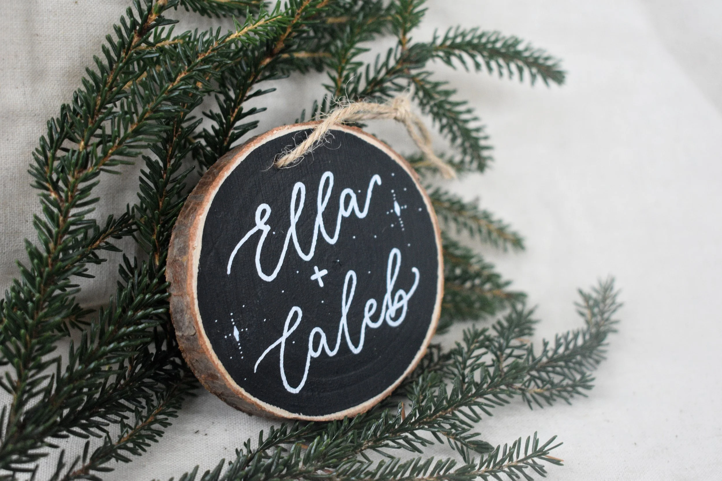 Add a touch of botanical charm to your tree with this hand painted Christmas decoration, featuring golden leafy vines . Each ornament is hand drawn and handwritten with your chosen name, making it a lovely keepsake.